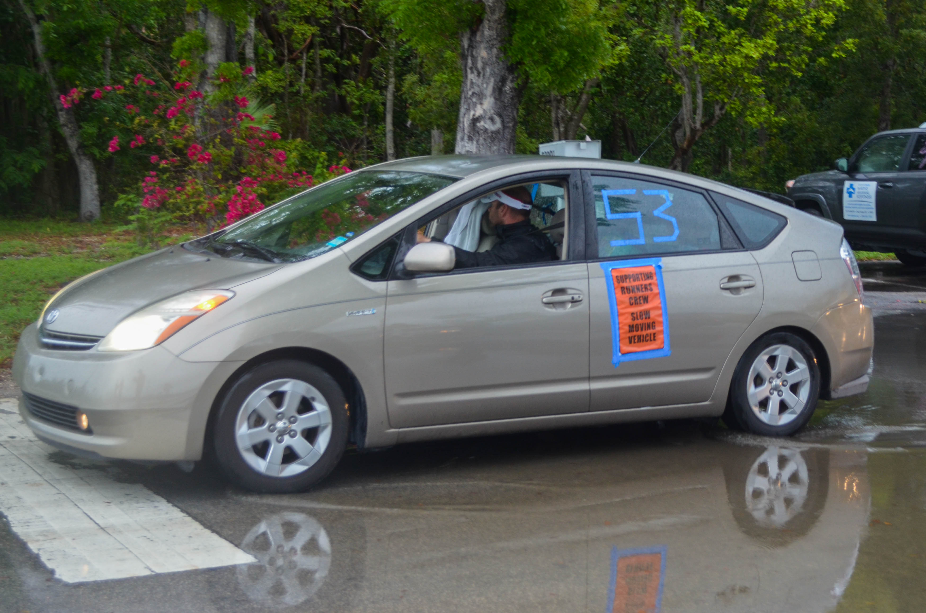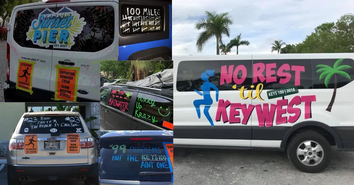 The runner or team bib number MUST be clearly visible on all four sides of the vehicle. This is the runner's responsibility. Window "crayon", painter's tape or prepared signs may be used as long as numbers are fully legible. You may add the runner or team name if you wish, but that is not required. Just be sure not to block rear window visibility.