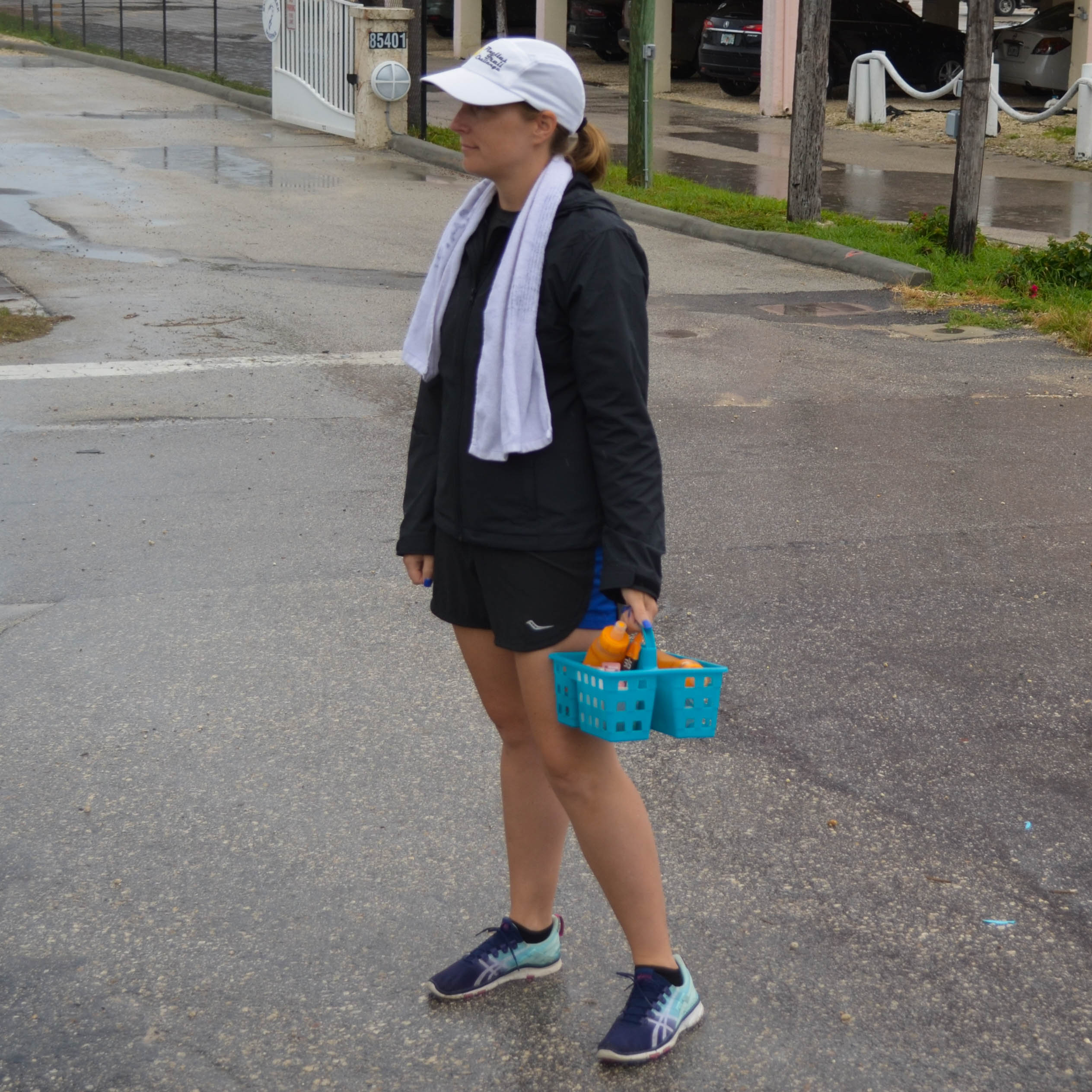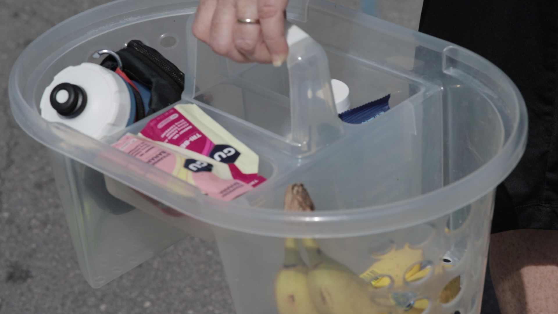 Offering choices when crew and runner meet; use a handy garden tool-type caddy like the one shown to display food and other options, collect "used" bottle and trash.